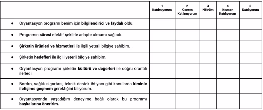Bunun için belirli zaman aralıklarında (örneğin 30, 60 ve 90. günde yeni başlayana Google Form ve Surveymonkey gibi anket araçları ile mini anketler gönderebilir, süreci iyileştirmek için geri bildirim isteyebilirsiniz.